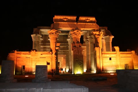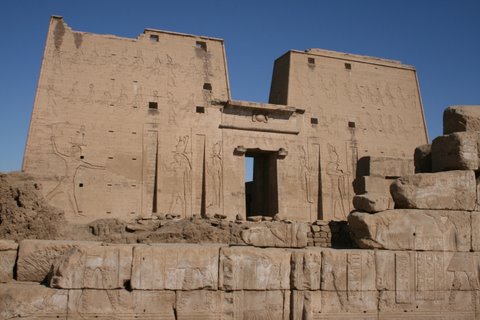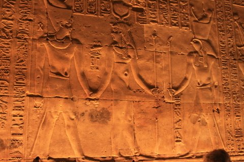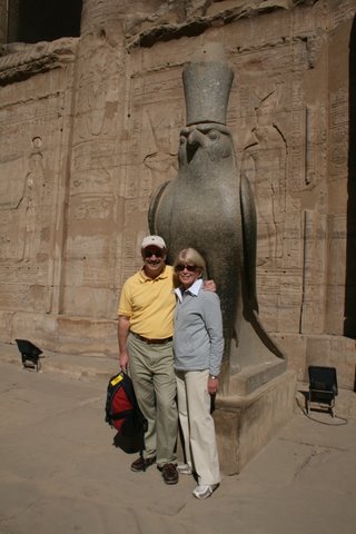 Steve’s photo of the Temple of Horus, the falcon god, which is located on the west bank of the Nile and is halfway between Luxor and Aswan. After Karnak, it is the second largest temple in Egypt and one of the most well-preserved. Right - Steve and Sally before the Horus, the falcon god.