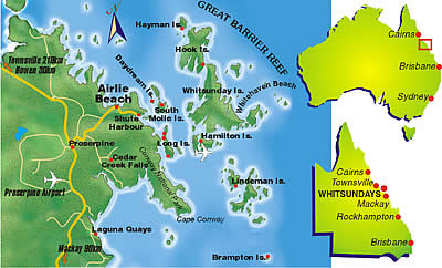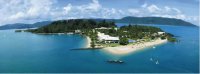 BRAMPTON ISLAND is located at the southern entrance to the Whitsunday Passage and is ringed by seven white, sandy, semi-secluded beaches and its own coral reef. The resort is 25 miles offshore and accessible from Mackay. Almost entirely a national park, the resort has only 106 rooms and does not cater to day trippers. The resort is inclusive of meals and most activities. |