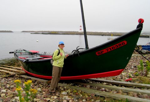 Sally with a Grand Banks dory. The Grand Banks is one of the richest fishing grounds in the world. Located off the southeast coast of Newfoundland on the North American continental shelf, they are a series of underwater plateaus where animal and plant life abound. This is where the cold Labrador Current mixes with the warm waters of the Gulf Stream and create an underwater environment full of nutrients which attracts cod, haddock, capelin, scallops and lobster plus many sea birds. |
