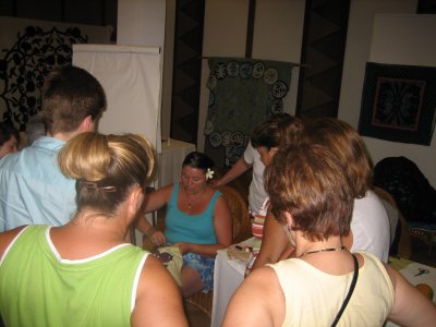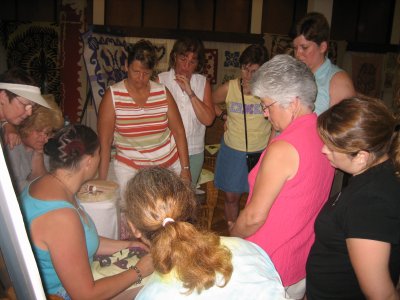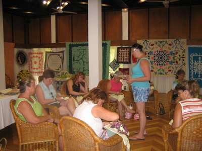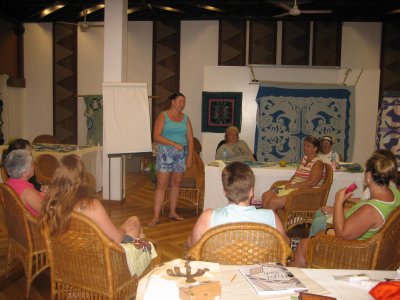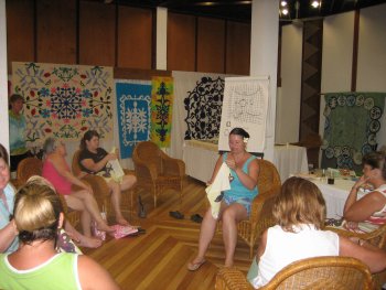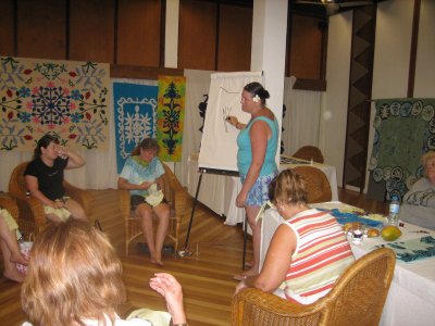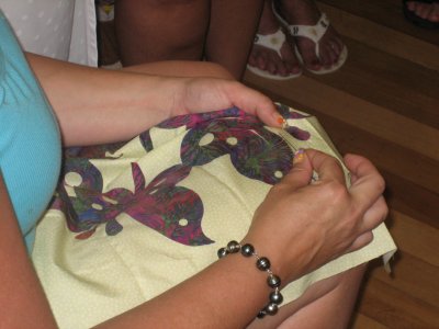 Didi conducted an Applique Workshop the day after the Design Workshop and she showed everyone how to applique their creations. She is a wonderful teacher and very, very patient. She had given everyone a butterfly (Mariposa) pillow tifaifai that she created that they could practice on. |