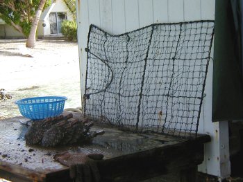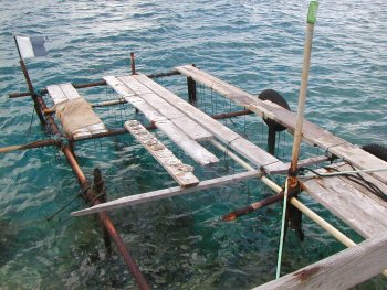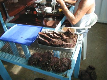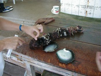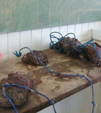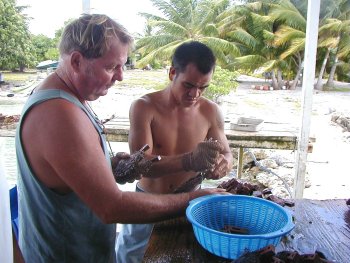 Several times a year, the black-lipped pearl oyster, which lives in the coral in the South Pacific, produces spawn which is fertilized in the water. These baby oysters are called spat and they float freely in the lagoon before attaching themselves to coral or dying out. The pearl farmer collects the spats on artifical collectors in the lagoon. They are reared on underwater lines for more than three years and when they reach maturity they are taken out of the lagoon for a short period of time, are carefully held open with a plastic stick similar to a clothespin, and turned over to the grafter for grafting. Click on The Grafter above to see the intricate process of grafting.