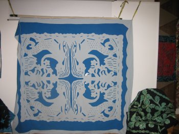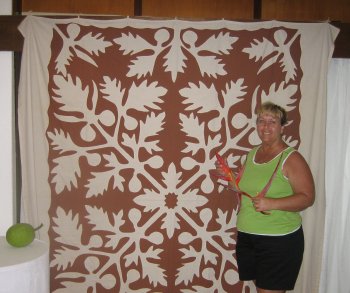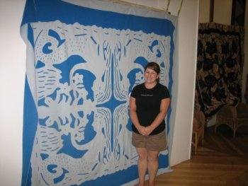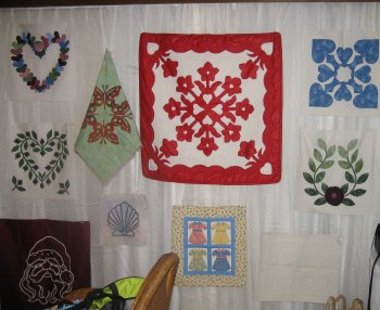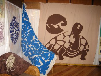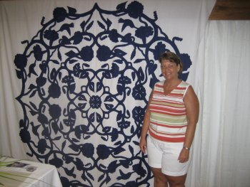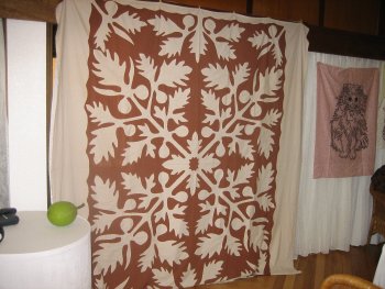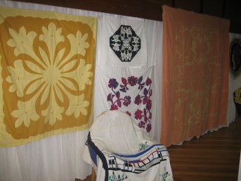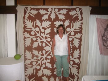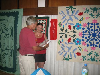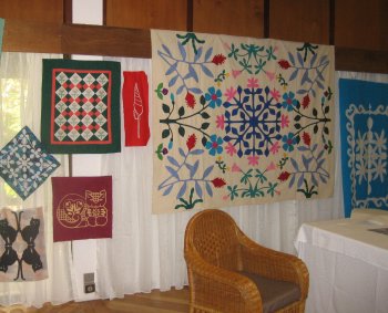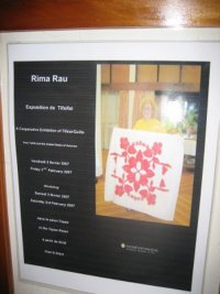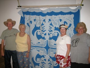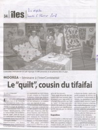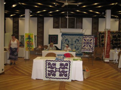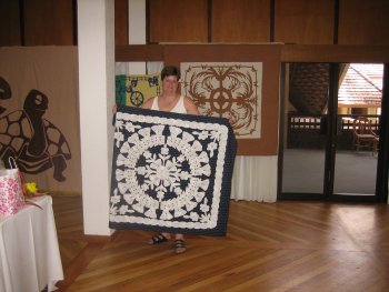 Didi organized the first exhibition of tifaifais on Moorea and it was a huge success. It was truly a culutural exchange as exhibited were tifaifais from some of the women and the mamas on Moorea, Didi and Roxanne McElroy tifaifais, and our group’s tifaifais and quilts that they brought along for the exhibition. A reporter from La Depeche came and interviewed Didi and then published an article in the local newspaper about Rima Rau. We will do the same thing on the next Insider’s Tour and the exhibit should be bigger. Sixty-six quilts and tifaifais were shown and the exhibit was open to the public and many people staying at the hotel came and viewed it. Didi is the only quilter in the United States that specializes in the tifaifai and through her efforts she is trying to keep the tradition of the Tahitian tifaifai alive and well. |