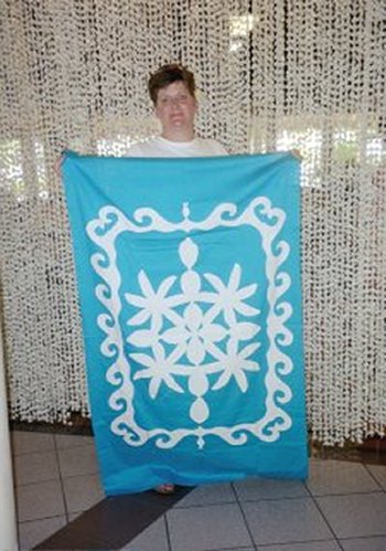 Aini wrote: “I lost my heart totally to the Polynesian islands. From the very first day descending the aeroplane after a 28-hour flight from Helsinki - Papeete and the wonderful smell of the flowers that came to me, made a feeling to me that is unforgettable. The lei I got around my neck, the beautiful flowers and all the different colours that were behind one’s ear everyday, it was just unforgettable. Also the fantastic view all around me during different excursions was amazing. The reefs, the shells, the fish, the pineapple fields, the hills, the Pacific Ocean with all its salt and warmth. The very special music you heard every morning on the TV, is something that I am listening to in Finland even today very often. How easy it was to walk when you did not need any furcoats or boots on you in the islands. Everything from the islands is just unforgettable. Due to all of this I made my tifaifai. In my tifaifai are the leis made of the wonderful flowers put around the pineapples combined with fish. The colour of my tifaifai is chosen because of the finnish flag; blue and white, my home country. But the colours can also be combined with the Pacific ocean and its reefs around the Polynesia islands.” |