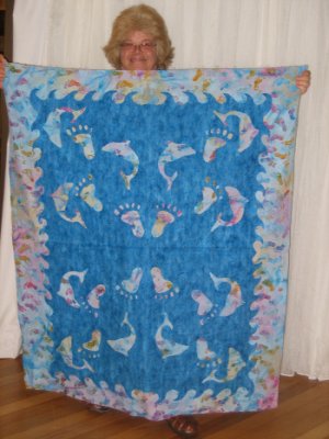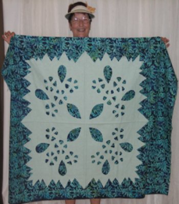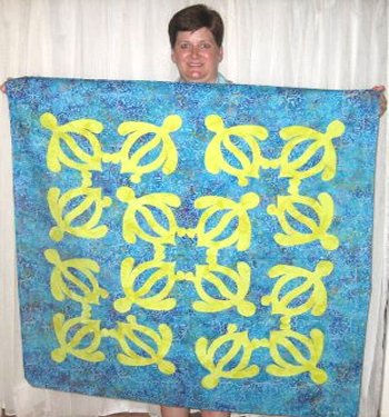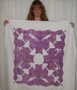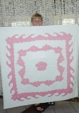 This is what Lisa said about her tifaifai. “The footprints are me walking along the beach and the dolphins swimming in the lagoon and they are there to give you wisdom. The dolphins that are curved around the footprints mean that there is still confusion in life and that you are not perfect.” Lisa had never quilted before and she designed this wonderful tifaifai! |
