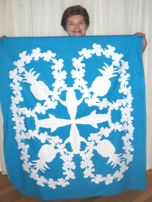 Kim described her tifaifai this way. “My tifaifai has a mermaid wearing a flower in her hair like the Tahitians do and she is surrounded by tiare flowers. There is a little figure that is hidden in the design and the mermaid is looking for love (represented by the hearts) but is not sure if she has found it or not.” Kim went on to say “Tahiti is a wonderful place and I will be back!” This was Kim and Janice’s second trip to Tahiti and Moorea. |