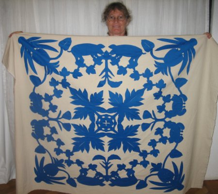 Carol lives in Moorea and she helped us put together the Rima Rau exhibit. She participated in Didi’s workshop and this is what she said about her tifaifai. “The main thing that I was thinking about when designing my tifaifai were the plants and animals that I wanted to represent: Piglets, papaya trees, sweet potatoes, land crabs & pineapples. I also wanted to make a traditional tifaifai where all of the elements are connected. It was difficult, as these elements are only related in my head in my life here on Moorea. I got stuck connecting them all till it dawned on me that there is a plant (a rampant weed-vine called “pohue”) which grows over everything here, literally connecting the individual trees and bushes in the forest. So the pohue connected it all on my tifaifai also. I just needed to take the time to see what I was looking at.” |