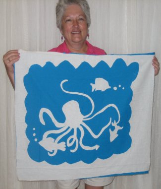 Janice said, “The first time that Kim and I went to Tahiti I fell in love with Moorea. I liked the quietness of it and the separateness and I loved the ocean and the blue colors. When we went to Magic Mountain on the Safari tour, Ghislaine told us that Moorea was the octopus head and the eight arms of the octopus were the ridges of the mountains and there I was standing there looking at it! We also saw an octopus at the three sister’s bungalow one night and we spent hours watching it. The outside of the tifaifai is just the waves of the ocean and the blue color symbolizes the beauty that is Moorea. To me the octopus is Moorea but also it brings back memories of the octopus and the fish we spent watching in the lagoon. I did a smaller version than the others did to represent the safety of the lagoon and Moorea. I would encourage anyone who gets a chance to go to Tahiti and Moorea to go and also encourage anyone to go on the Insider’s Tour as we had such a great time together!” |