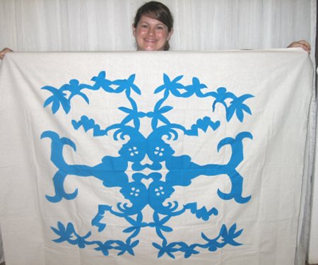 Becky did this tifaifai in 2006 when she was part of the Insider’s Tour. She told me: “The blue represents the vivid colors that I found in Tahiti and I fell in love with the flowers and the waves on the outside were the ones that were crashing on the reef and the smooth waves inside were the ones that come into the lagoon. My tifaifai also represents the awesome flowers, the ocean and the colors of Tahiti.” |