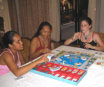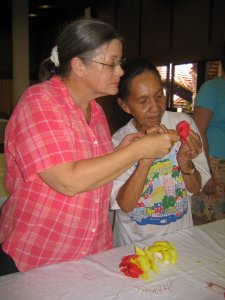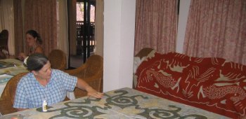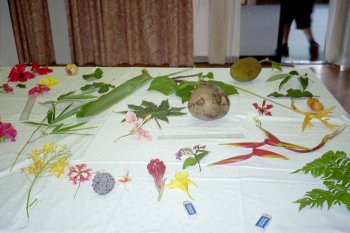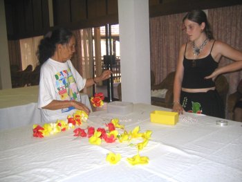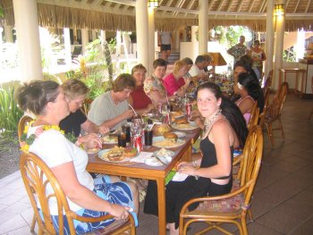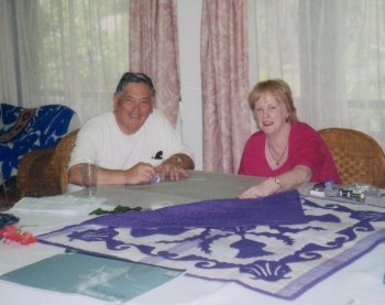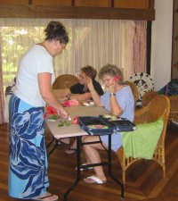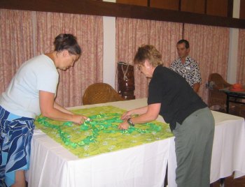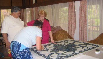 Sunday, January 22: The quilters collected plants and designed their tifaifai patterns based on what they had collected and what they had experienced on the tour. Once they designed their patterns, they basted them onto a piece of material and then cut out the pattern. The cloth pattern was then basted onto another piece of material. On Monday, they spent another 1/2 day in a workshop while Didi taught her special applique technique. A tifaifai is a lightweight version of a quilt, suitable for the hot Polynesian climate. When you finish looking at this page, click on The Tifaifais button to see the wonderful tifaifais that were created.